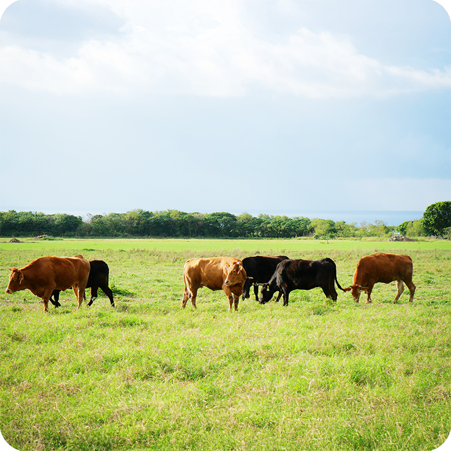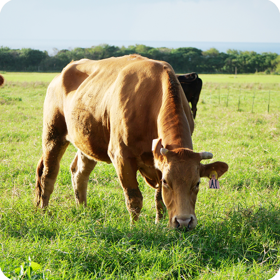 - 石垣島産あか牛は、成長期の1年余りを放牧地で過ごします。広い牧草地を自由に歩き、草を食べるという自然に近い環境での飼育を取り入れ、牛の状態を日々確認しながら、成長に必要な分だけ餌で補いながら育てています。一般的な舎飼い中心の飼育とは異なる、石垣島の環境を活かした方法です。