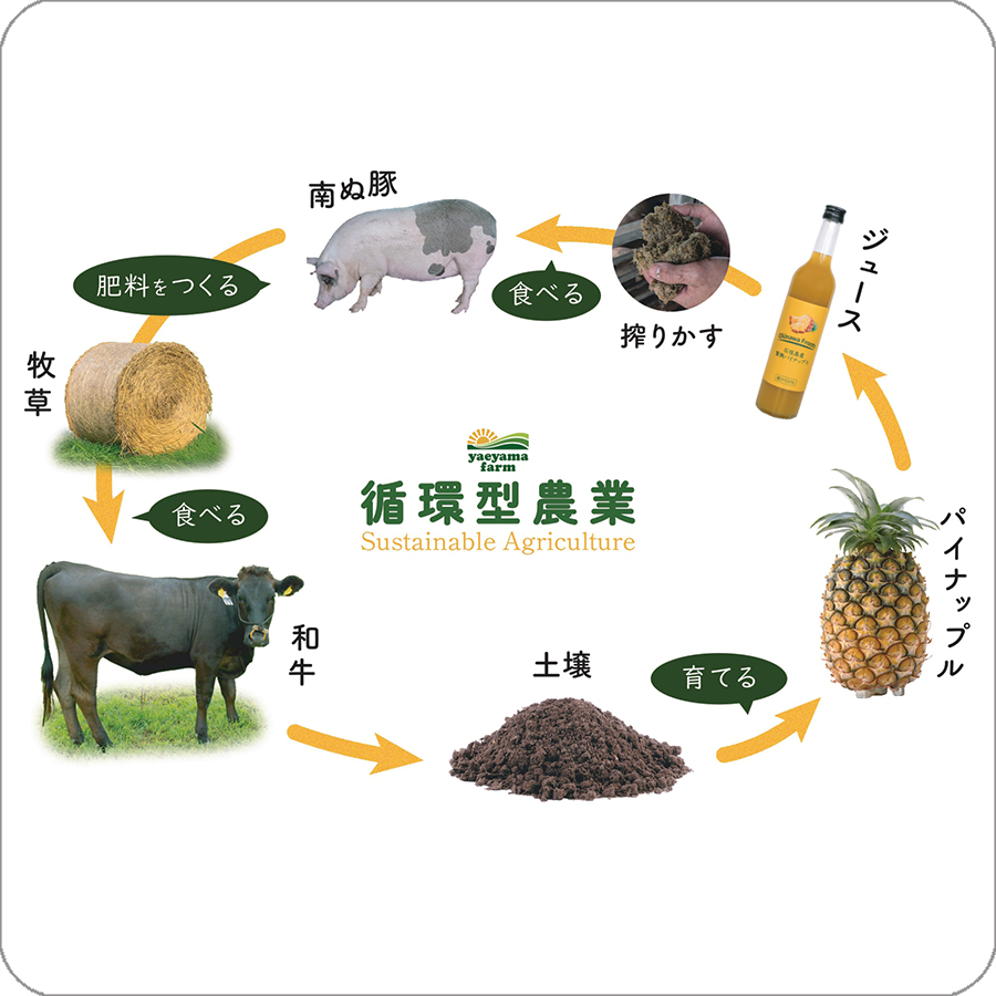 - やえやまファームは、美味しい肉をつくるだけの牧場ではありません。 循環型の農畜産を実践し、泡盛粕の再利用、サトウキビや島の副産物の活用、メタンガスの削減など、環境負荷を減らす取り組みを続けています。 これは、“島の未来を守りながら、美味しい肉をつくる”という覚悟の証です。