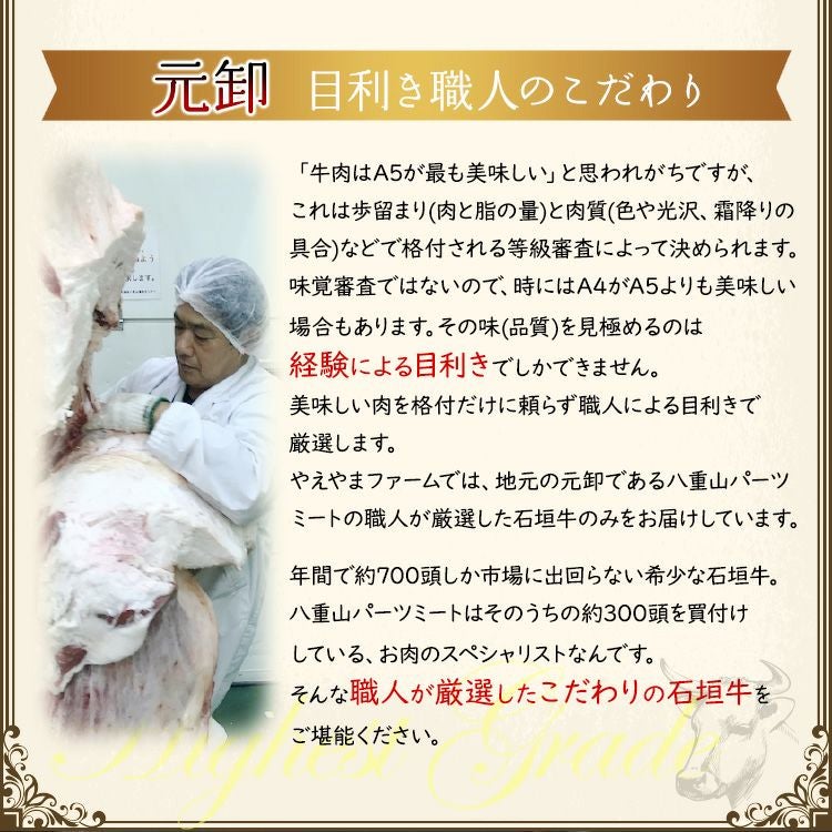 石垣牛は、2000年に行われた沖縄サミット首脳会議の晩餐会でメインディッシュとして振る舞われました。 各国の首相や大統領をもてなし、高い評価を頂いた上質な黒毛和牛です。