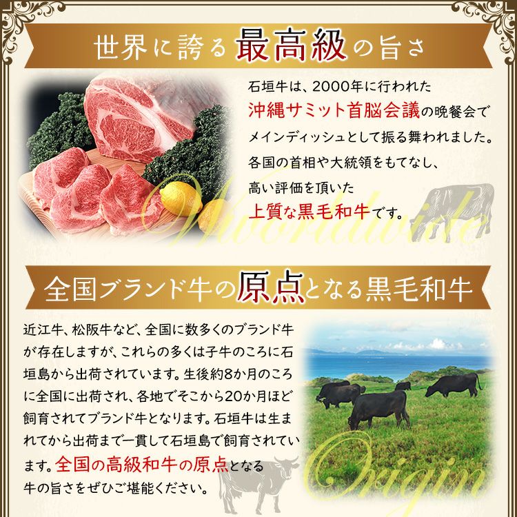 石垣牛は、2000年に行われた沖縄サミット首脳会議の晩餐会でメインディッシュとして振る舞われました。各国の首相や大統領をもてなし、高い評価を頂いた上質な黒毛和牛です。