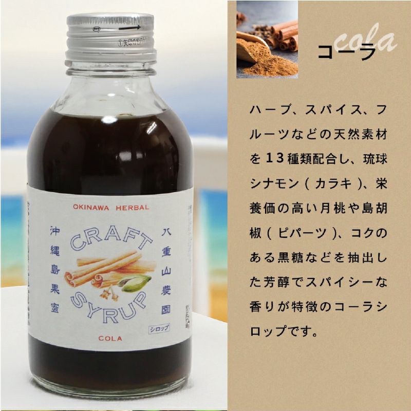 沖縄で採れるハーブ、スパイス、フルーツなどの天然素材を13種類配合し、琉球シナモン(カラキ)、栄養価の高い月桃や島胡椒(ピパーツ)、コクのある黒糖などを抽出した芳醇でスパイシーな香りが特徴のコーラシロップです。 香料、保存料無添加。 <お召し上がり方> お好みに合わせて炭酸水やお酒などで4~5倍を目安に薄めてお召し上がりください。