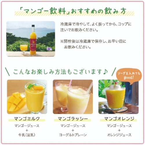 沖縄県産の厳選した完熟マンゴー果汁50%を使用。マンゴーならではの濃厚さを残しつつ、すっきりとした美味しさに仕上げました。内容量:500ml賞味期限:製造日より540日※ボックス入り
