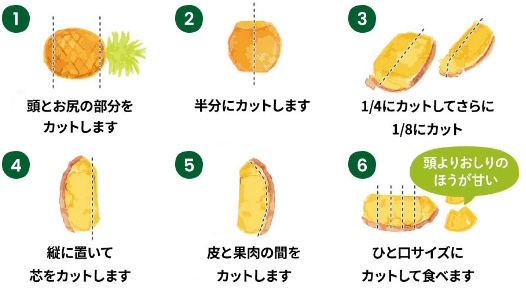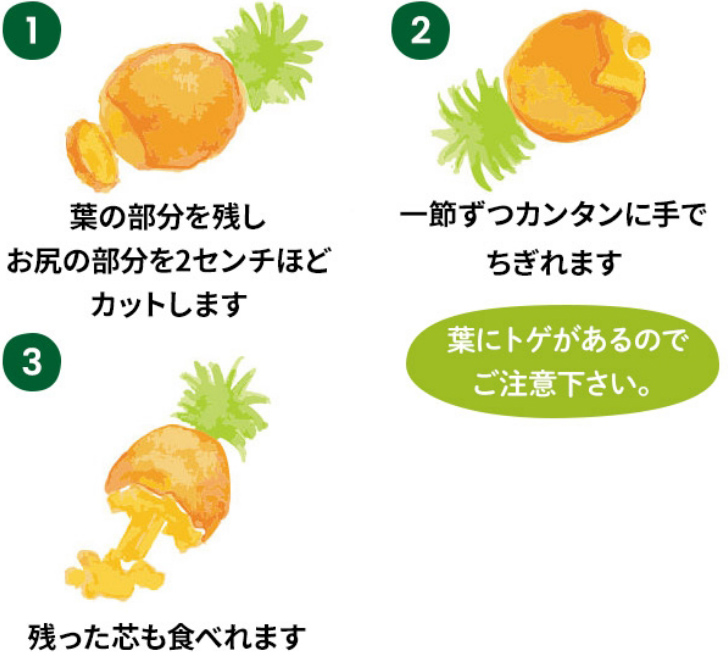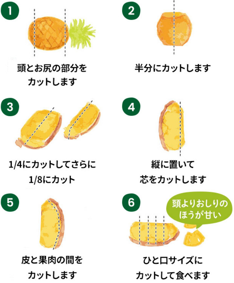 生で食べる場合は上の葉の部分を残し、お尻の部分を2センチほど切り落とします。※根の方が甘みが強いのであまり切り過ぎないようにしてください。 ちぎって食べていくだけで、キレイに芯だけ残るようになっていますので、芯をえぐり取る必要はありません。 ※ボゴール種(スナックパイン)の芯はとても甘みが強いので是非食べてみてください!