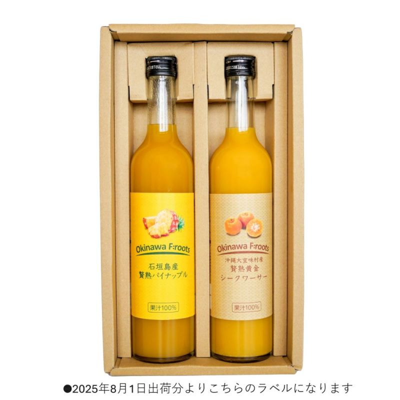 贅熟 沖縄果実のジュースシリーズの中から、石垣島産パインアップルジュースと大宜味村産黄金シークヮーサージュースの2本をセットに。内容量:各500ml賞味期限:パインアップルジュース/製造日より540日、黄金シークヮーサージュース/製造日より360日※ギフトボックス入り