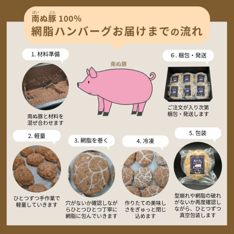 石垣島のパイナップルを食べて育った希少なアグー豚(※F1種) 「南ぬ豚(ぱいぬぶた)」を使用した豚100%のハンバーグです。やわらかい肉質で甘みがあり、ジューシーなのにヘルシーな脂身を、網脂で包み肉汁や旨みを中に閉じ込めました。ソースが要らないほどの旨味を是非一度ご賞味ください。 ご家族の皆さんや、お友達とシェアが出来る大容量10個入りです。ソースが要らないほどの旨味を是非一度ご賞味ください。 ※純血アグー豚の雄と多品種の雌を交配した交配種