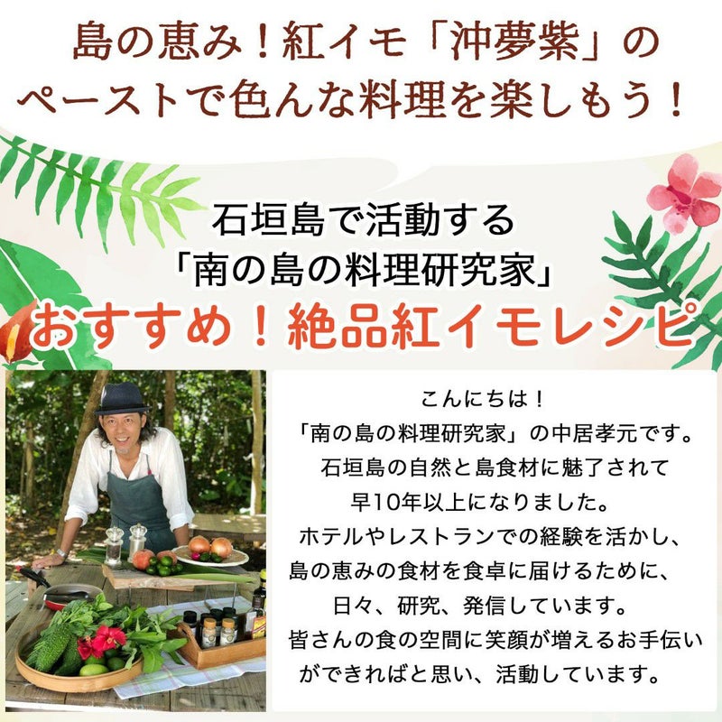 上品な甘さが特徴の石垣島産の紅芋「沖夢紫」を使いやすいペーストにしました! 様々な料理やスイーツにお使いいただけます。