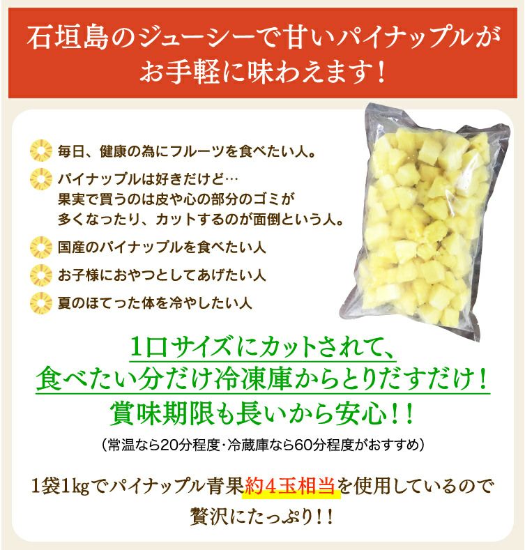 ジューシーで甘い石垣島産パイナップルをお手軽に味わえます! ヨーグルトやおやつ・アイスと一緒に。もちろんそのまま食べても美味しい♪
