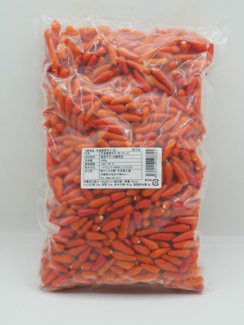 沖縄県で栽培・収穫された島唐辛子(赤)を新鮮なうちに冷凍して袋に包装しました。中華料理やパスタ、お肉料理の辛み(薬味)としてお使いいただけます。自作の調味料(コーレーグース)や植物油で辛みを引き出すこともできます。ピリッとくる激辛と後から感じられる旨味をお楽しみください。 お得な大容量1㎏。