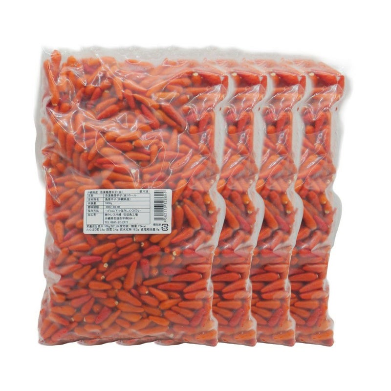 沖縄県で栽培・収穫された島唐辛子(赤)を新鮮なうちに冷凍して袋に包装しました。中華料理やパスタ、お肉料理の辛み(薬味)としてお使いいただけます。自作の調味料(コーレーグース)や植物油で辛みを引き出すこともできます。ピリッとくる激辛と後から感じられる旨味をお楽しみください。 お得な大容量1㎏×4袋。