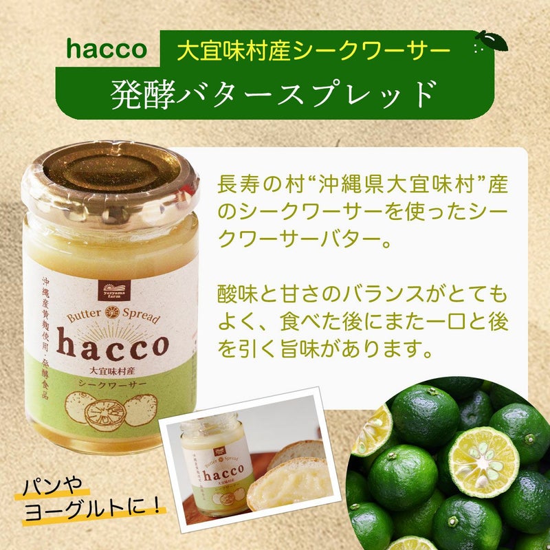厳選された沖縄食材と沖縄産黄麹を使用した着色料無添加の発酵バタースプレッドです。 黄麹は、長年日本酒造りに使われてきた代表的な種麹。 「味噌」「醤油」「清酒」造りに用いられており、黒麹や白麹も、もともとは黄麹からできたもの。 麹自体の味の癖がなく、でんぷんやたんぱく質の分解能力が高く、どんな食材に合わせても邪魔をせず旨味を引き出してくれるのが特徴です。 そんな黄麹で「大宜味村産シークワーサー」を発酵させて作りました。酸味と甘さのバランスがとてもよく、食べた後にまた一口と後を引く旨味があります。 また素材そのものを活かすために、着色料は一切使用しておりません。 ※本品には米麹由来の米粒が含まれています。