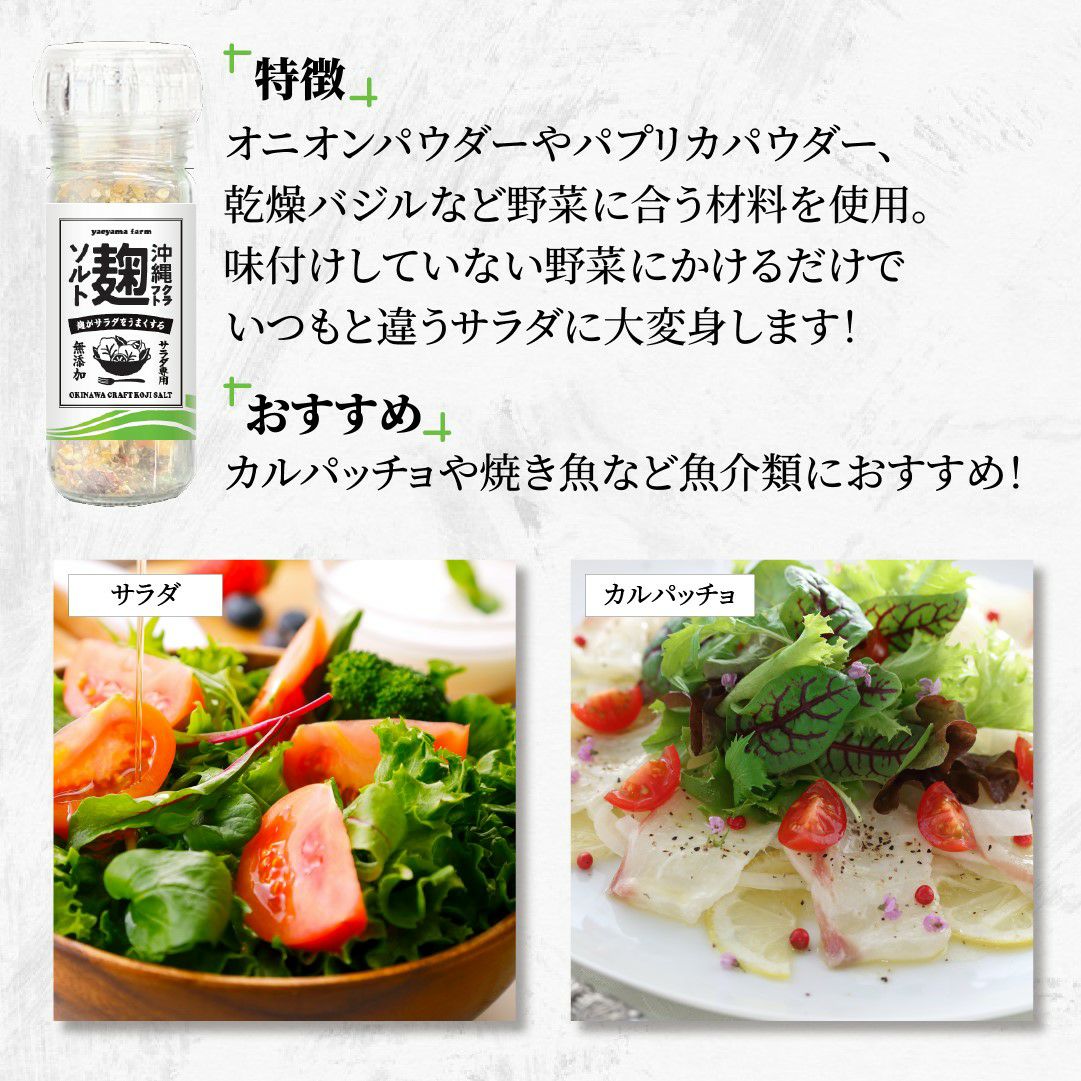 “沖縄の生きた麹” で「腸活」できる、五感で味わうクラフトソルトです。沖縄県製造の塩をベースに月桃、島唐辛子、島胡椒(ピパーツ)などの琉球ハーブや国産の陳皮で香りをつけてひとつひとつ手作りしました。ミルタイプでその場で挽きたての香りが味わえます。野菜はもちろん、焼き魚やカルパッチョにもよく合います。
