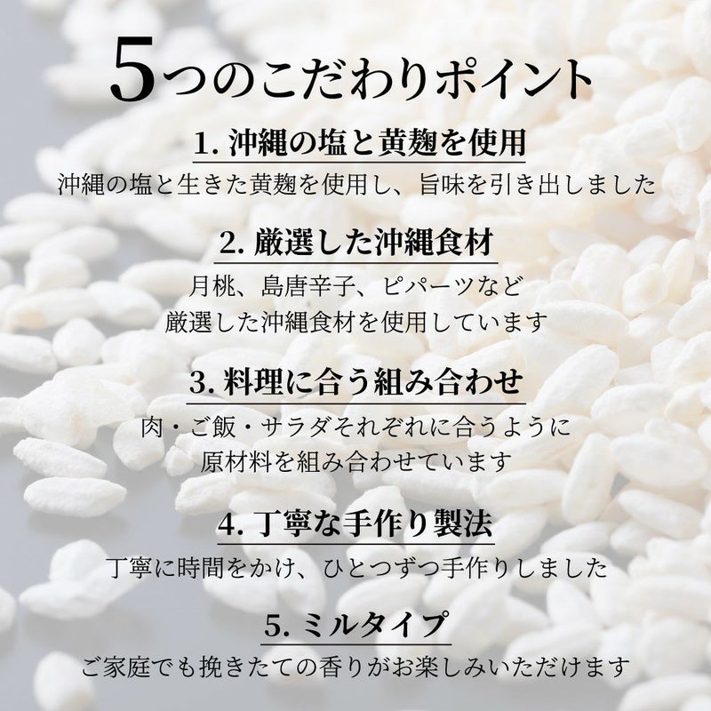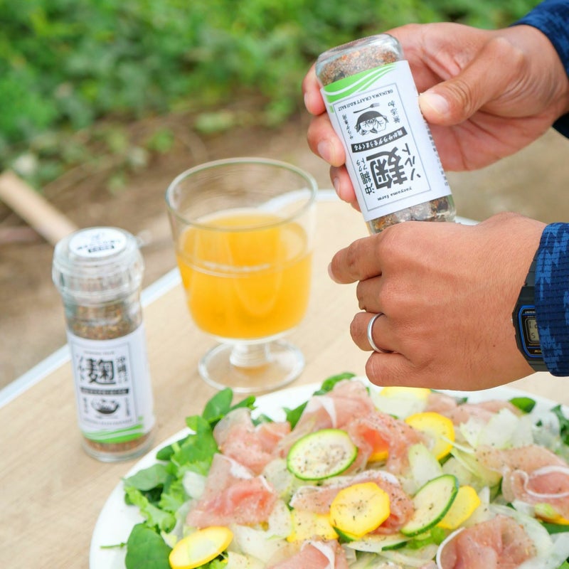 “沖縄の生きた麹” で「腸活」できる、五感で味わうクラフトソルトです。沖縄県製造の塩をベースに月桃、島唐辛子、島胡椒(ピパーツ)などの琉球ハーブや国産の陳皮で香りをつけてひとつひとつ手作りしました。ミルタイプでその場で挽きたての香りが味わえます。野菜はもちろん、焼き魚やカルパッチョにもよく合います。