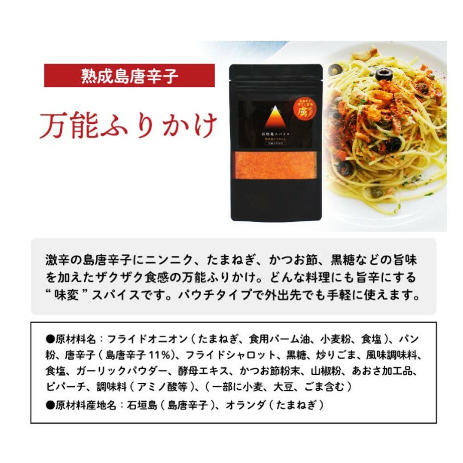 激辛の島唐辛子に、ニンニク、たまねぎ、かつお節、黒糖などの旨味を加えたザクザク食感の万能ふりかけ。 どんな料理にも旨辛にする“味変”スパイスです。パウチタイプで外出先でも手軽に使えます。ホカホカ白ごはんを代表に、パスタやピザトーストなどアレンジひとつで、もっと美味しくなります。※ネコポスでの配送となります。
