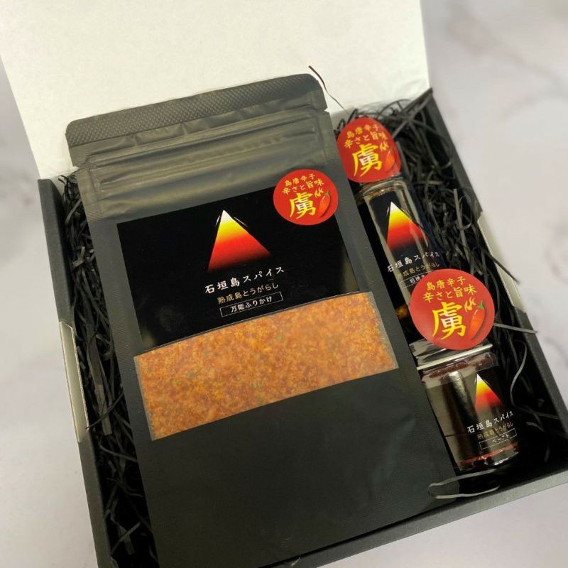 石垣島スパイスが堪能できる3種(粗挽き一味、ペースト、万能ふりかけ)の詰合せセットです。ご自宅用だけでなく、ギフトにもおすすめです。
