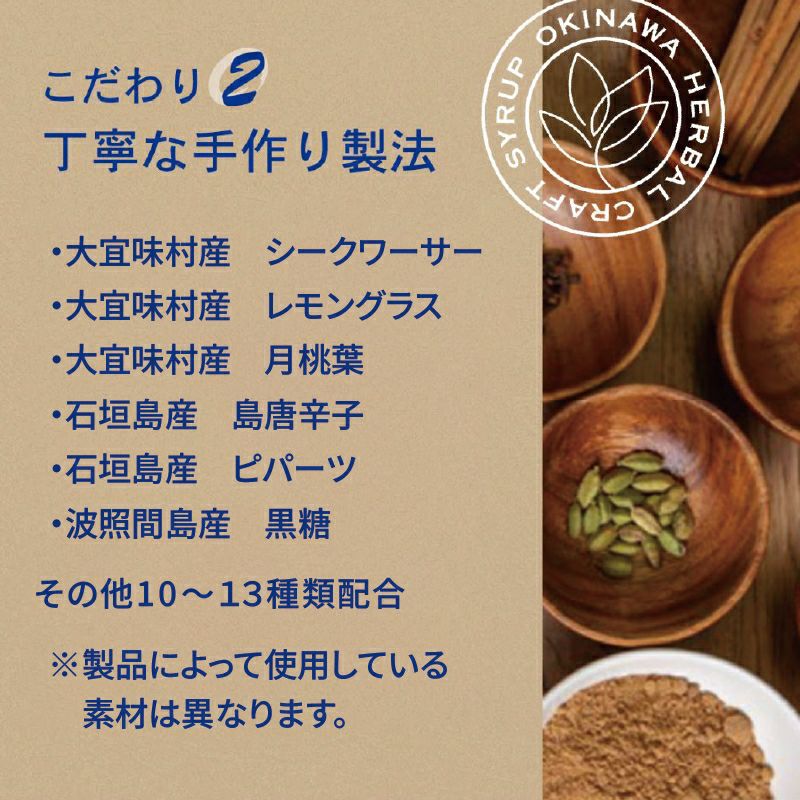 沖縄で採れるハーブ、スパイス、フルーツなどの天然素材を手造りで製造しました。スパイシーな香りが特徴のコーラシロップ、スパイシーな余韻が楽しめる絶妙なバランスのシークワーサーシロップ、黒糖のまろやかさとジンジャーの刺激が特徴の黒糖ジンジャーシロップの3種類の詰合せセットです。香料、保存料無添加。 <お召し上がり方> お好みに合わせて炭酸水やお酒などで4~5倍を目安に薄めてお召し上がりください。