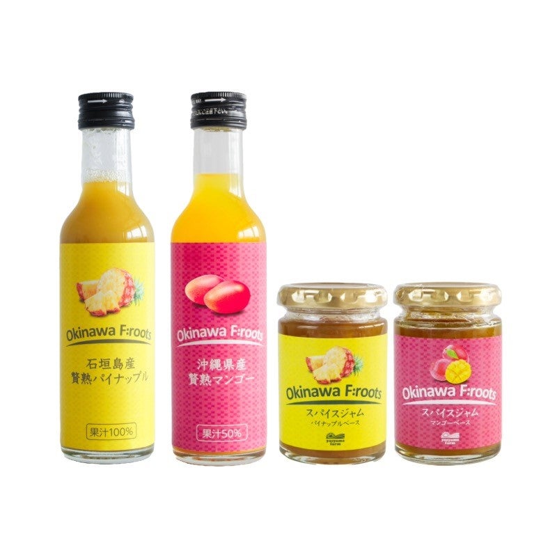 ●石垣島産 贅熟パイナップル 果汁100% 200ml石垣島産パイナップルの中でも鮮度、糖度、酸度のバランスが取れた完熟の原料のみにこだわった “無添加・無調整・夏絞り限定”の100%ストレートジュースです。 ●沖縄県産 贅熟マンゴー 果汁50% 200ml 沖縄県産の厳選した完熟マンゴー果汁50%を使用。マンゴーならではの濃厚さを残しつつ、すっきりとした美味しさに仕上げました。 ●スパイスジャム パイナップルベース・マンゴーベース 沖縄県産のパイナップルやマンゴーに島唐辛子やピパーツ(島胡椒)などのスパイスを効かせた刺激的な大人のジャム。肉料理、魚料理、チーズ、ハム、サラダなどに添えて食べれば、いつもの料理が劇的に美味しくなります! ※ギフト箱に入れてお届けします。