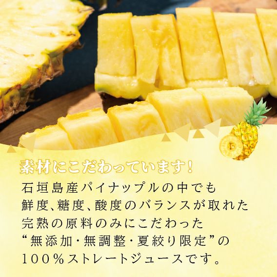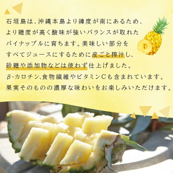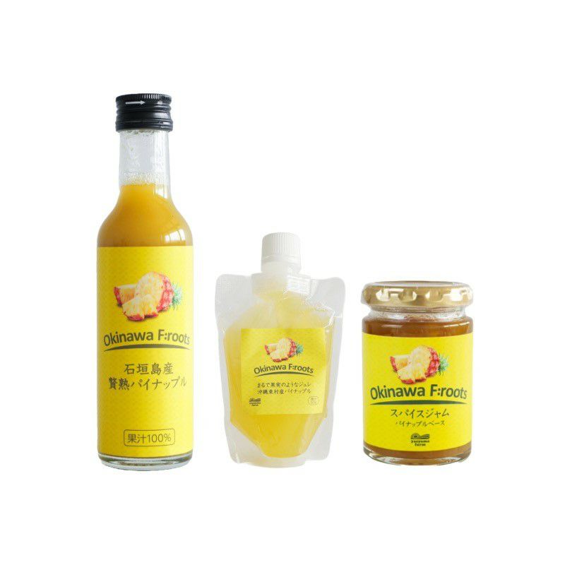 ●石垣島産 贅熟パイナップル 果汁100% 200ml石垣島産パイナップルの中でも鮮度、糖度、酸度のバランスが取れた完熟の原料のみにこだわった “無添加・無調整・夏絞り限定”の100%ストレートジュースです。 ●まるで果実のようなジュレ 沖縄東村産パイン 沖縄県東村パイナップルは、日本一の生産量を誇り大切に栽培されております。その中でも樹熟・完熟パイナップルの果肉をジュレに閉じ込めました。 ●スパイスジャム パイナップルベース 沖縄県産のパイナップルに島唐辛子やピパーツ(島胡椒)などのスパイスを効かせた刺激的な大人のジャム。肉料理、魚料理、チーズ、ハム、サラダなどに添えて食べれば、いつもの料理が劇的に美味しくなります! ※ギフト箱に入れてお届けします。