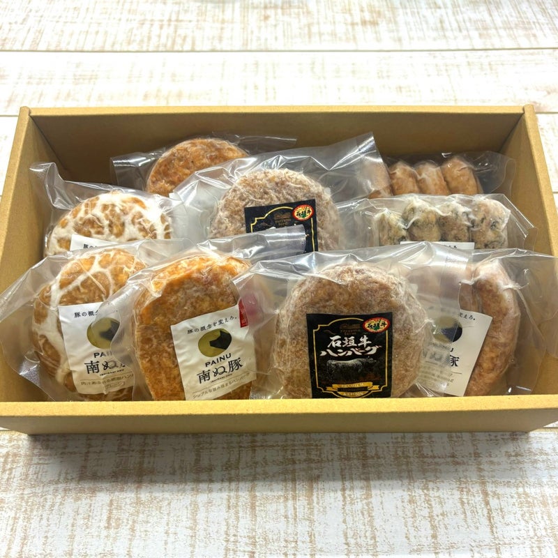石垣島のパイナップルを食べて育った希少なアグー豚 「南ぬ豚(ぱいぬぶた)」、石垣島産黒毛和牛「石垣牛」。自社牧場で愛情をこめて育てたお肉を贅沢に使用したハンバーグの食べくらべセットと、大人気の無添加ソーセージの食べくらべセットを詰め合わせたギフトにおすすめのセットです。※無添加ソーセージについては特定アレルギー物質は使用していません。
