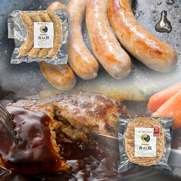 沖縄県優良県産品受賞の南ぬ豚ハンバーグとお子様にも安心な無塩せきソーセージのセット。
