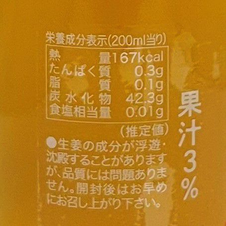 原材料名 糖類(グラニュー糖(国内製造)、黒糖)、果汁(シークワーサー、パイナップル)、レモングラス、シナモン、ピパーツ、生姜エキス、生姜粉末、月桃の実、ウコン粉末、島唐辛子/炭酸ガス