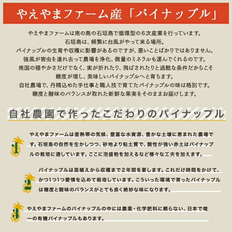 やえやまファームは亜熱帯の気候、豊富な水資源、豊かな土壌に恵まれた農場です。石垣島の自然を生かしつつ、砂地より粘土質で、酸性が強い赤土はパイナップルの栽培に適しており、様々な工夫で土壌を改良して美味しいパイナップルを育てています。 石垣島は、頻繁に台風がやって来る場所。 パイナップルの生育や収穫に影響があるのですが、悪いことばかりではありません。強風が害虫を連れ去って農場を浄化し、微量のミネラルも運んでくれるのです。 南国の穏やかさだけでなく、実が折れたり、飛ばされたりと過酷な条件だからこそ糖度が増し、美味しいパイナップルへと育ちます。 自社農場で、丹精込めた手仕事と職人技で育てたパイナップルの味は格別です。糖度と酸味のバランスが取れた新鮮な果実をそのままお届けします。