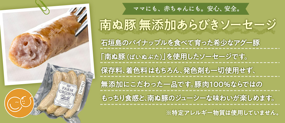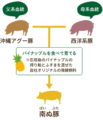 南ぬと書いて「ぱいぬ」と呼びます。「南」とは八重山諸島の方言で「みなみ」を意味し、「ぬ」は助詞の「の」が変化したものです。 南ぬ豚(アグー豚)は沖縄本島より約410km離れた南の島、石垣島にあるやえやまファームの自社牧場で育ちます。 父豚が純血アグー種、母豚に西洋豚をもつアグー豚(F1種)は幸福牧場で生まれ、石垣島のパイナップルの搾り粕とふすまを混ぜた自社オリジナルの発酵飼料を食べて大自然の石垣島ですくすく育ちます。そんな自社ファームで愛情たっぷりに育てた豚を「南ぬ豚(アグー豚)」として日本全国へ届けています。「南ぬ豚(アグー豚)」は年間出荷頭数も500頭と非常に希少性の高いブランド豚なのです。
