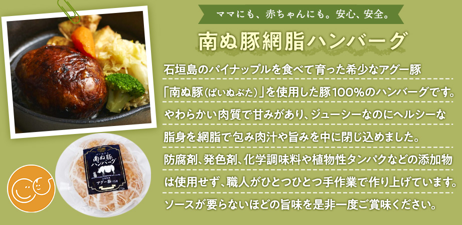 石垣島のパイナップルを食べて育った希少なアグー豚(※F1種) 「南ぬ豚(ぱいぬぶた)」を使用した豚100%のハンバーグです。やわらかい肉質で甘みがあり、ジューシーなのにヘルシーな脂身を、網脂で包み肉汁や旨みを中に閉じ込めました。ソースが要らないほどの旨味を是非一度ご賞味ください。 ※純血アグー豚の雄と多品種の雌を交配した交配種
