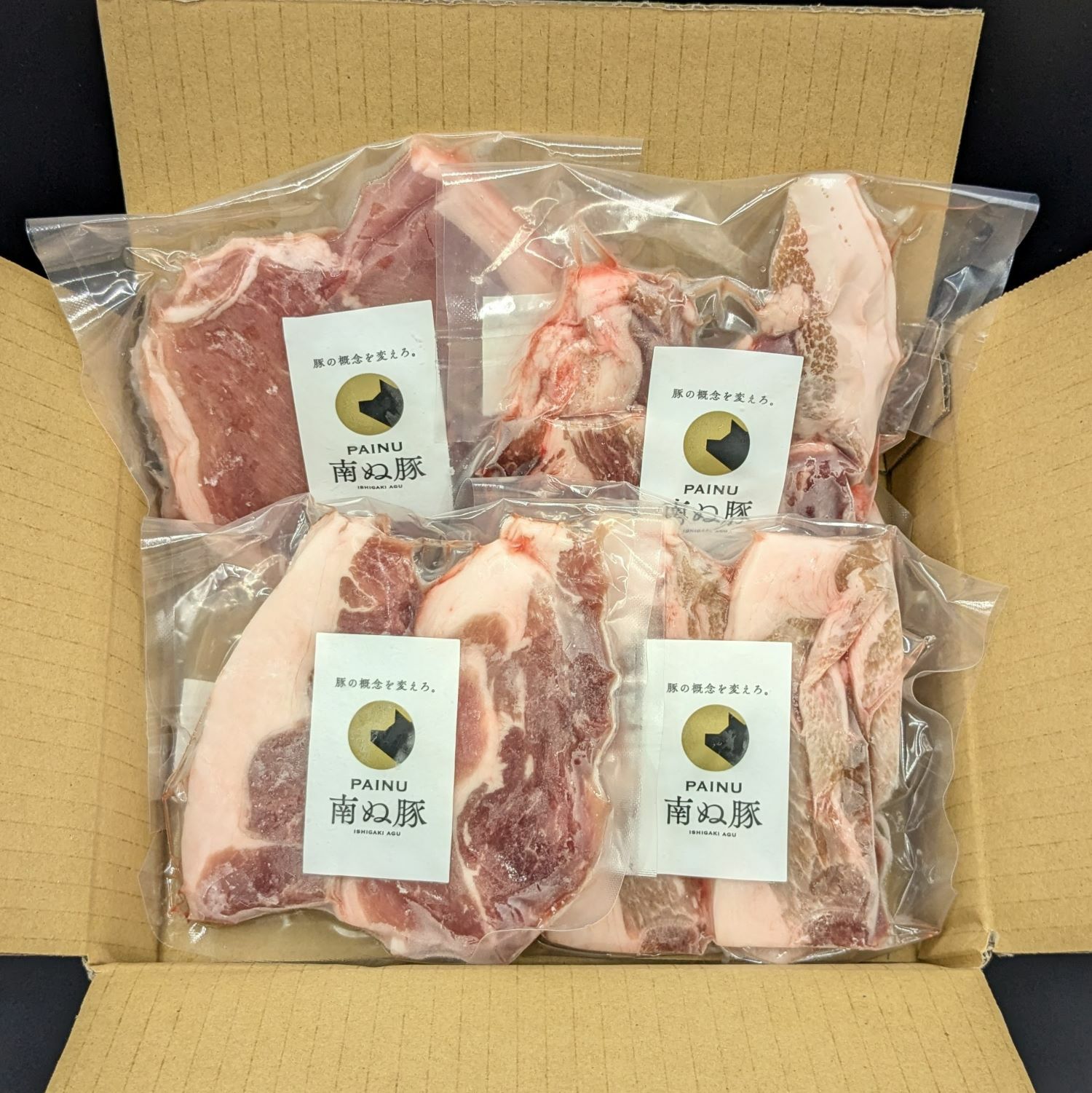 父豚が純血アグー種、母豚に西洋豚をもつアグー豚(F1種)は幸福牧場で生まれ、石垣島のパイナップルの搾り粕とふすまを混ぜた自社オリジナルの発酵飼料を食べて大自然の石垣島ですくすく育ちます。そんな自社ファームで愛情たっぷりに育てた豚を「南ぬ豚(アグー豚)」として日本全国へ届けています。「南ぬ豚(アグー豚)」は年間出荷頭数も500頭と非常に希少性の高いブランド豚なのです。