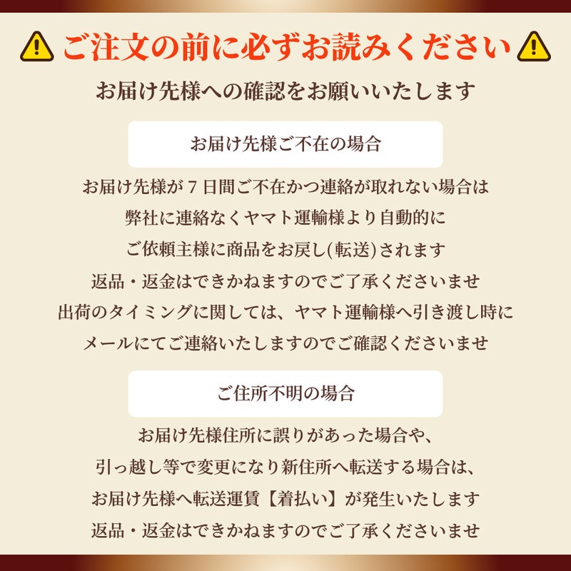 ご注文のキャンセル・返品については次の通りとなります。 お客様ご都合による返品・交換は受け付けておりません。 万一発送中の破損、不良品、あるいはご注文と違う商品が届いた場合は、返送料は弊社が負担いたします。 お手数をお掛け致しますが、商品到着後7 日以内に事前にご連絡頂き、返送お願いします。 商品の中には生鮮食品も含まれており、お受けできない場合も御座います。