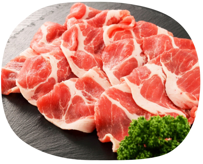 尻の周囲の部位。脂身が少なく赤身が中心で、高タンパク低脂肪が特徴です。 ビタミンB1も多く含まれています。切り身、角切り、薄切り、ひき肉とさまざまな形状で販売されています。 内モモは色が淡くて柔らかめ、ボンレスハムなどに使われます。外モモは色が濃く硬めで、こま切れにして使われることが多いようです。