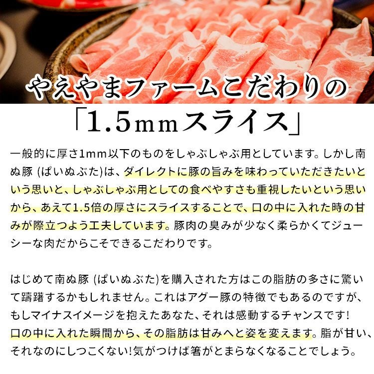 やえやまファーム独自のパイナップル発酵飼料を与えた南ぬ豚ならではの部位ごとの味を堪能いただけるよう、バラ、ロース、肩ロースをしゃぶしゃぶ用セットにしました。